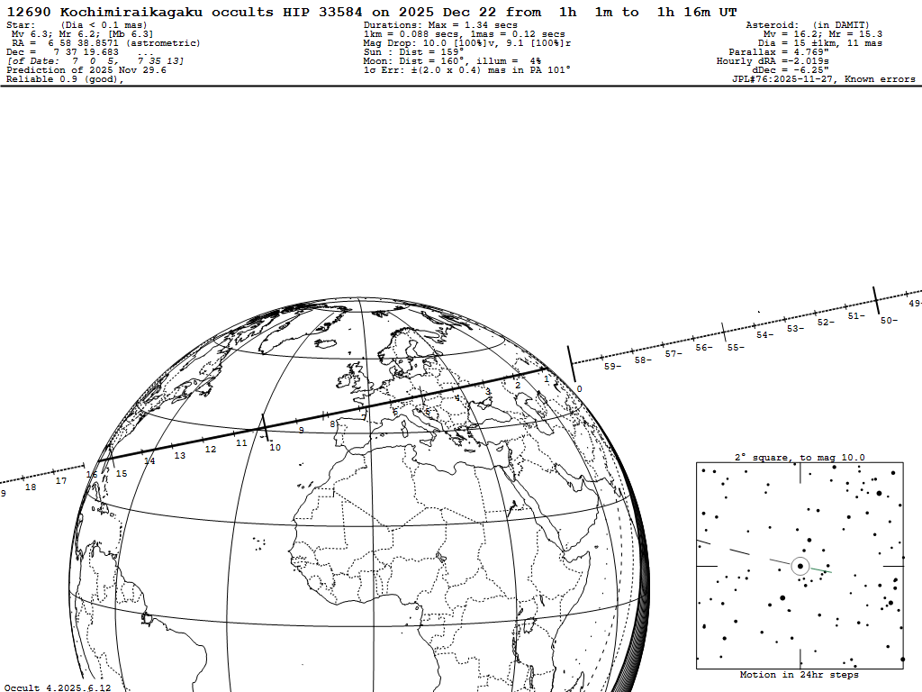 22 грудня в 3 03 за Києвом відбудеться покриття яскравої зорі НІР 33584 6.4 зоряної величини, астероїдом (12690) Kochimiraikagaku 16.5 з. вел.