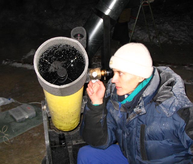 - Ну да, а вы чего хотели? Ведь данное фото призвано иллюстрировать, что даже в лютый мороз с примерзшим к окуляру глазом истинный астроном продолжал наблюдать (до вспышки) слабейшие туманные объекты... И всё благодаря противороснику, который спасает, в данном случае, диагоналку. 8-)